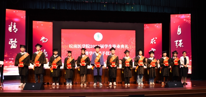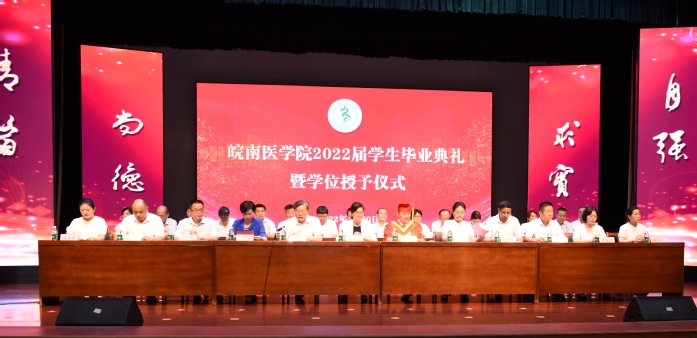 伴着歡快喜慶的旋律,夏勁松為安徽省優秀畢業生代表頒發證書。校領導為畢業生代表頒發學位證書、畢業生證書。學位評定委員會主席廖聖寶為2022年獲得碩士學位、學士學位的畢業生扶正流蘇。