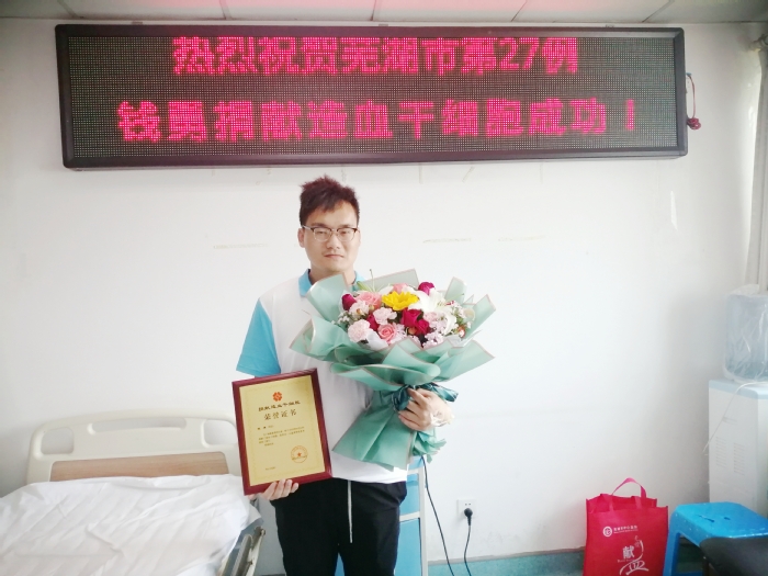 錢勇是我校研究生學院2020級外科學專碩研究生,熱心陽光的他經常活躍在學校的各項志願服務活動中。2015年,錢勇在無償獻血時加入中華骨髓庫,成為中華骨髓庫的一名志願者。在本科和研究生期間,錢勇共無償獻血4次,總獻血量達1600ml。2022年4月1日,錢勇接到安徽省紅十字會通知,得知自己與一名外省的白血病患者造血幹細胞配型成功,他沒有遲疑當場就表示願意捐獻,并第一時間配合開展高分辨分型檢測。為了确保捐獻成功,在臨床專碩研究生忙碌的學習、工作之餘,他積極進行捐獻前的各項準備工作,HLA高分辨配型成功和體檢合格後,他堅持調整飲食、作息,堅持鍛煉,體重減少近4公斤,以良好的身體狀态等待采集的這一天。從5月19日開始,錢勇入住弋矶山醫院血液内科,連續5天進行9次動員針注射,每天抽血檢測白細胞濃度,為捐獻造血幹細胞做最後的準備。