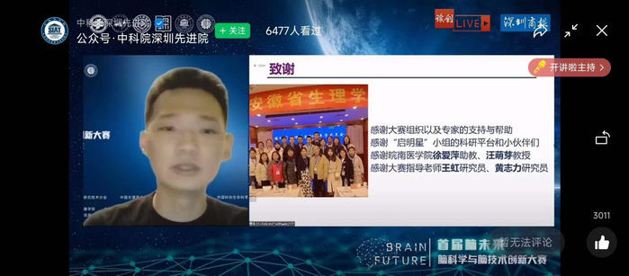 在總決賽啟動儀式上,中國神經科學學會理事長、中國科學院院士張旭,中國生理學會理事長、北京大學王韻教授現場緻辭。決賽邀請多位知名神經科學專家擔任大賽評委,全程通過“中科院深圳先進院”公衆号、“深圳商報”等進行在線直播。我校何仁可同學線上參加了決賽,比賽過程中,他沉着冷靜、表現優秀,充分展示了自己的學術成果、研究思路、特色亮點,彰顯了“啟明星”小組獨特的創新思維能力和紮實的動手操作能力,受到了暨南大學任超然教授等多位評委的高度評價。最終,何仁可從參與高中/本科賽道的12名選手中脫穎而出,獲大賽二等獎,在6名獲獎人中位居第3名。