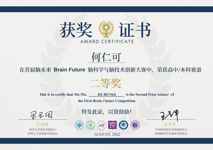 8月25日,由中國神經科學學會神經科學研究技術分會與中國生理學會自主神經專業委員會聯合主辦,中國科學技術協會生命科學學會聯合體協辦,深圳理工大學(籌)、中科院深圳先進技術研究院共同承辦的全國“首屆腦未來:腦科學與腦技術創新大賽”(簡稱“腦未來大賽”)總決賽在中科院深圳先進技術研究院以線下線上相結合的形式舉行。經過激烈角逐,我校生理學省級重點學科“啟明星”小組成員、2018級臨床醫學本科生何仁可同學喜獲二等獎。
