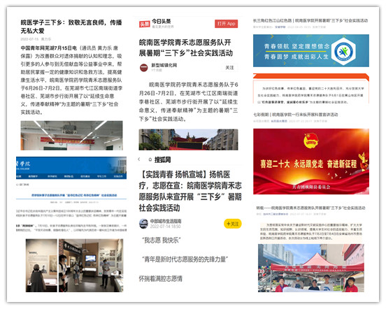 為擴大藥學院“三下鄉”團隊的社會影響力,各實踐團隊在活動結束後,及時撰寫新聞報道,達到積極的宣傳與引導效果,累計發表新聞稿15篇,被安徽學聯、多彩大學生網、中青校園、今日頭條、騰訊新聞、中國校園公益網、一線聚焦、搜狐網、城市新聞、新型城鎮化網、法制晨報、資訊周刊、宣州區團委微信公衆号等多家新聞媒體登載報道,産生了良好的社會影響。